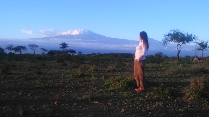 C’est pas très impressionnant, en photo, comme ça… mais l’amas de nuage à gauche, s’il se déplace, c’est la splendeur du massif entier du Kilimanjaro qui apparaît; combien de fois je retiens mon souffle, combien de fois le sommet du Kibo joue à cache cache, surgit furtivement, disparaît à nouveau, par dessus, par dessous les strates cotonneuses!